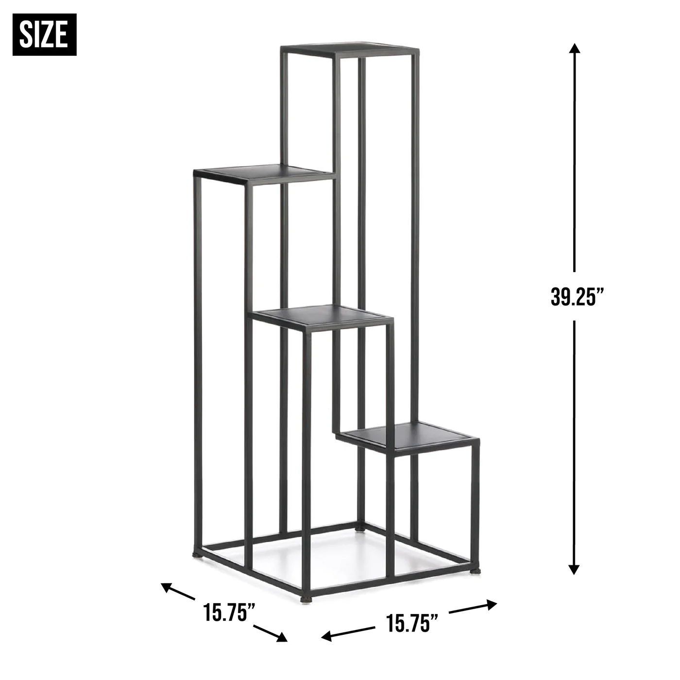 • Mix modern and natural decor elements with this four tier plant stand. The plant stand features a minimalist geometric design with four square platforms made from solid iron in a matte black finish. With enough space to support four large house plants, this decorative plant stand is guaranteed to draw attention in any space.